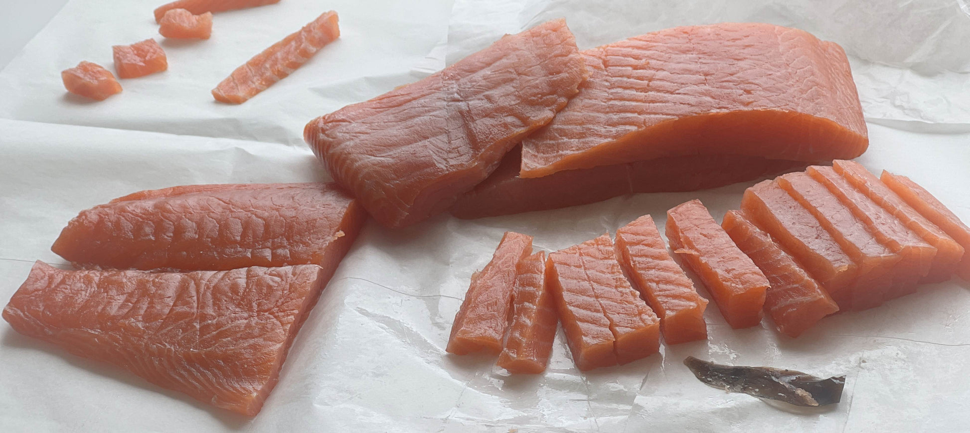 Once the smoking process is finished, I cut the smoked salmon fillet into seven sections and then slice pieces from each section to make up a pack. Each 40 gram pack contains around 14 pleces of my smoked salmon, which all vary in size, flavour and texture. There are at least two pieces from each section: